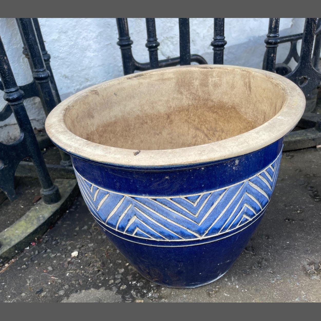 A large blue glazed and patterned ceramic frost-free garden container - dimensions 30cm height x 40cm diameter