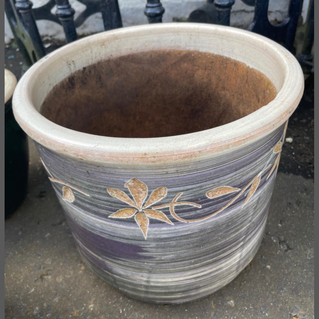 A large light-blue glazed and patterned ceramic frost-free garden container - dimensions 30cm height x 40cm diameter