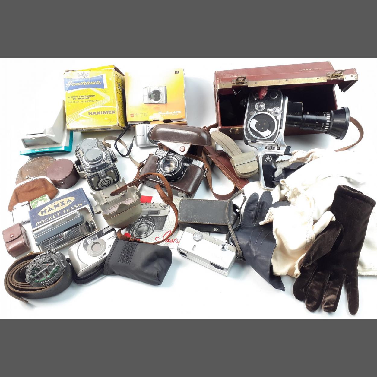 A mainly photographic lot to include a BOLEX Palliard with a BERTHIOT zoom lens in leather case, a HANIMEX slide projector, a MINOLTA AL camera, a ROLLEIFLEX cine camera and others