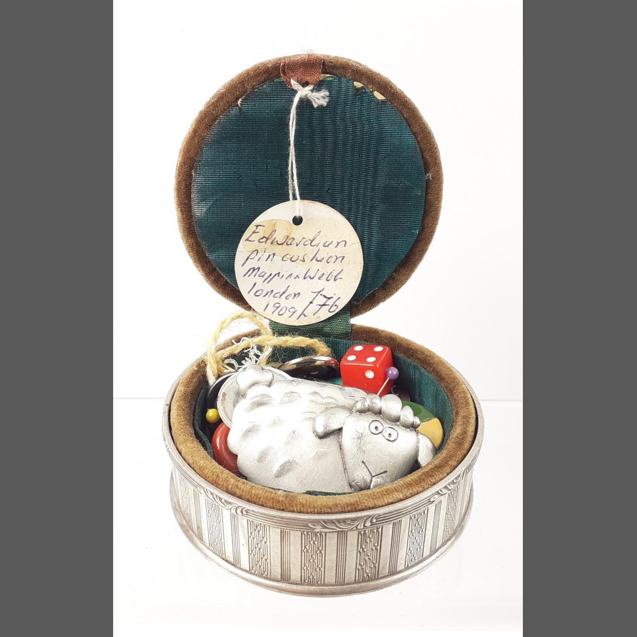 An ANTIQUE pin cushion with silver ring by MAPPIN & WEBB hallmarked, London 1909, weighing approx 39.6g approx, with contents, approx 8cm diameter