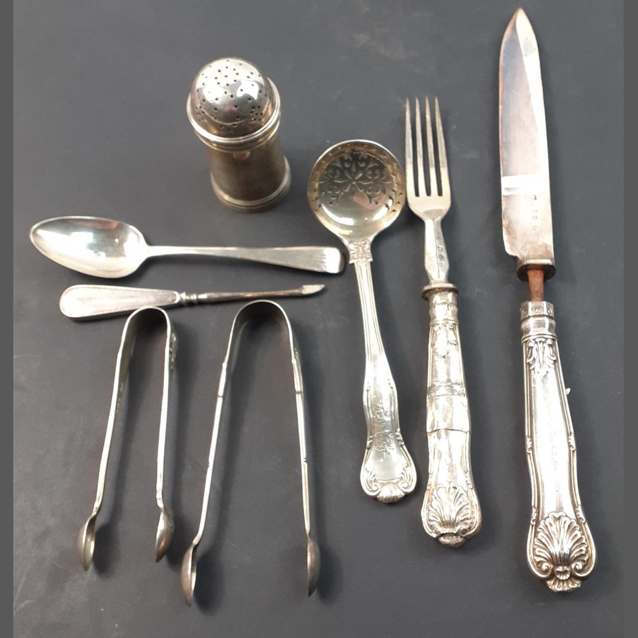 A small collection of silver items of interest to include a small MAPPIN & WEBB sifter (73.5g approx), a Victorian tea strainer (67g approx), 2 pairs of hallmarked nips (51g approx), a Georgian teaspoon (18g approx), 2 silver handled pieces of cutlery