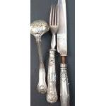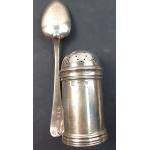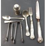 A small collection of silver items of interest to include a small MAPPIN & WEBB sifter (73.5g approx), a Victorian tea strainer (67g approx), 2 pairs of hallmarked nips (51g approx), a Georgian teaspoon (18g approx), 2 silver handled pieces of cutlery