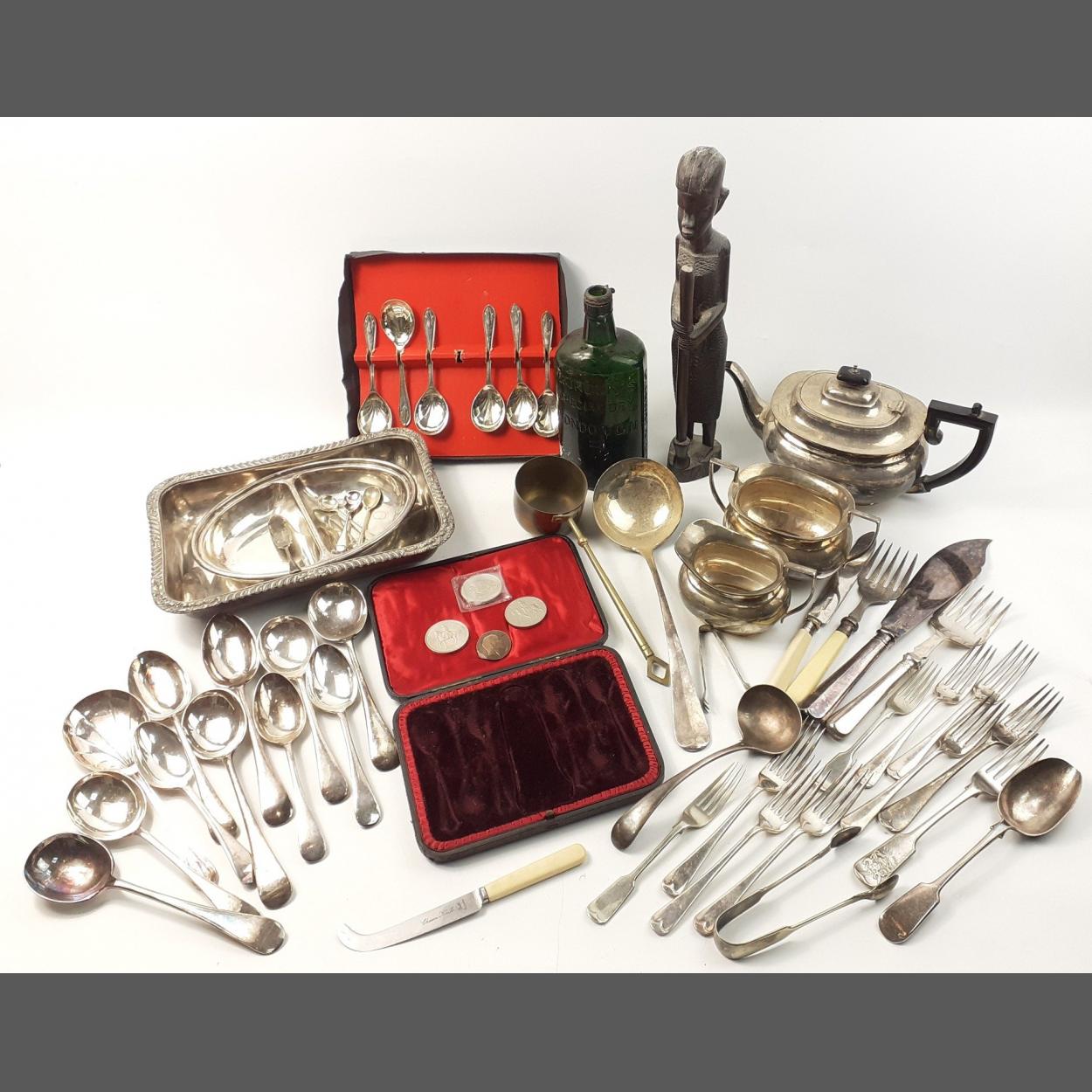 A mixed plated lot to include 2 trays, teapot, sugar and cream, much flatware and others
