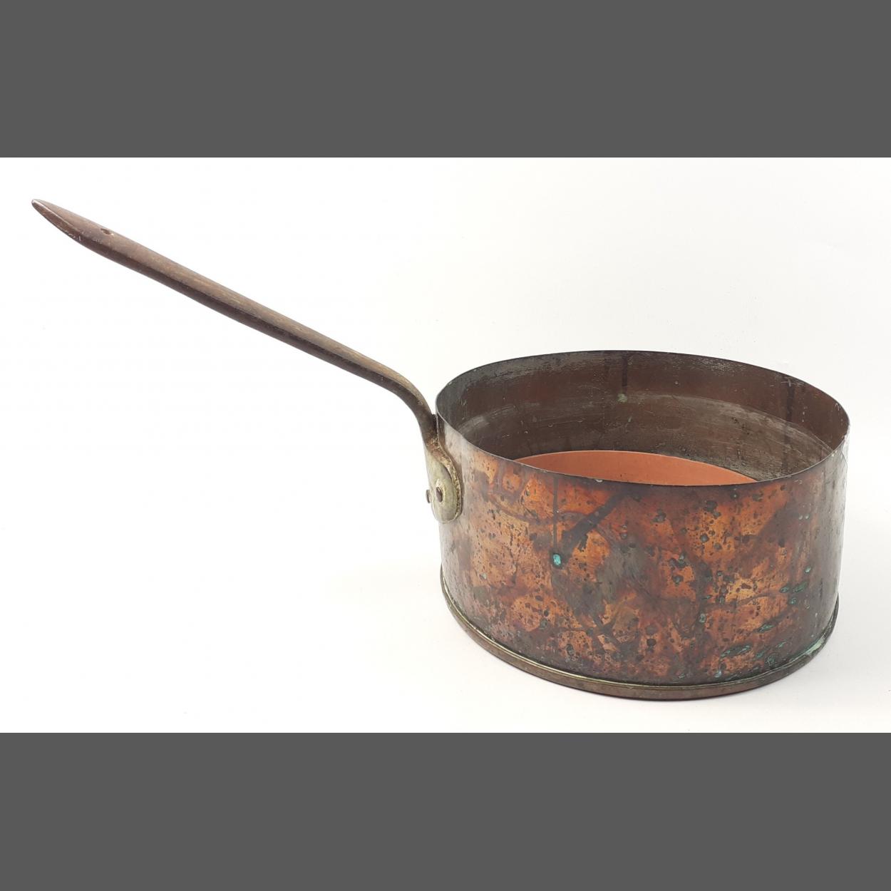 A substantial large copper saucepan 27cm diameter, latterly used as a planter