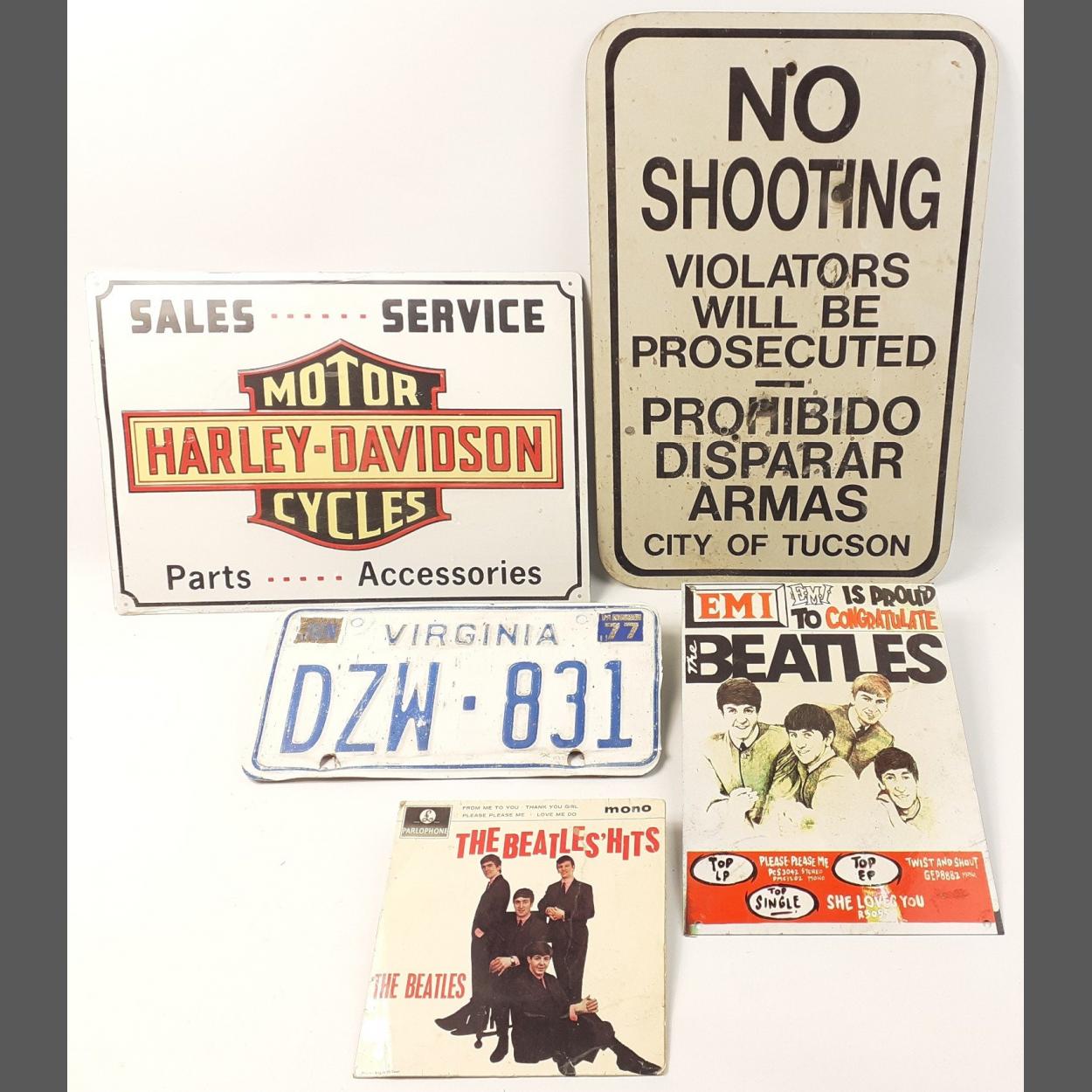 A small collection of garage/mancave memorabilia to include a modern City of Tuscon sign (with bullet holes), Beatles tin sign, Harley Davidson sign and an original 1977 Virginia car plate