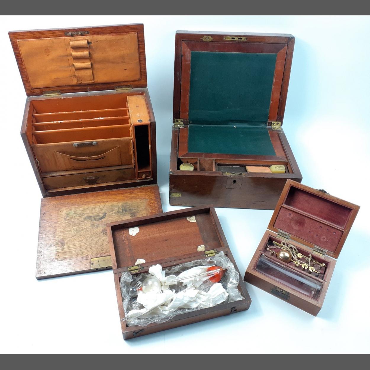 Four lovely wooden boxes to include a slightly distressed brass banded writing slope, 38x23x15cm, a travelling writing box and 2 small boxes of brewing related interest.