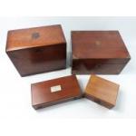 Four lovely wooden boxes to include a slightly distressed brass banded writing slope, 38x23x15cm, a travelling writing box and 2 small boxes of brewing related interest.
