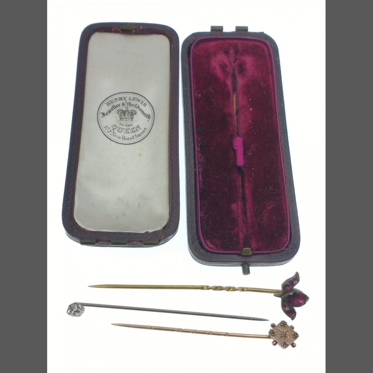A super collection of gentlemen's tiepins in an antique case, one marked 9ct to rear (weight 1g approx), the others unmarked