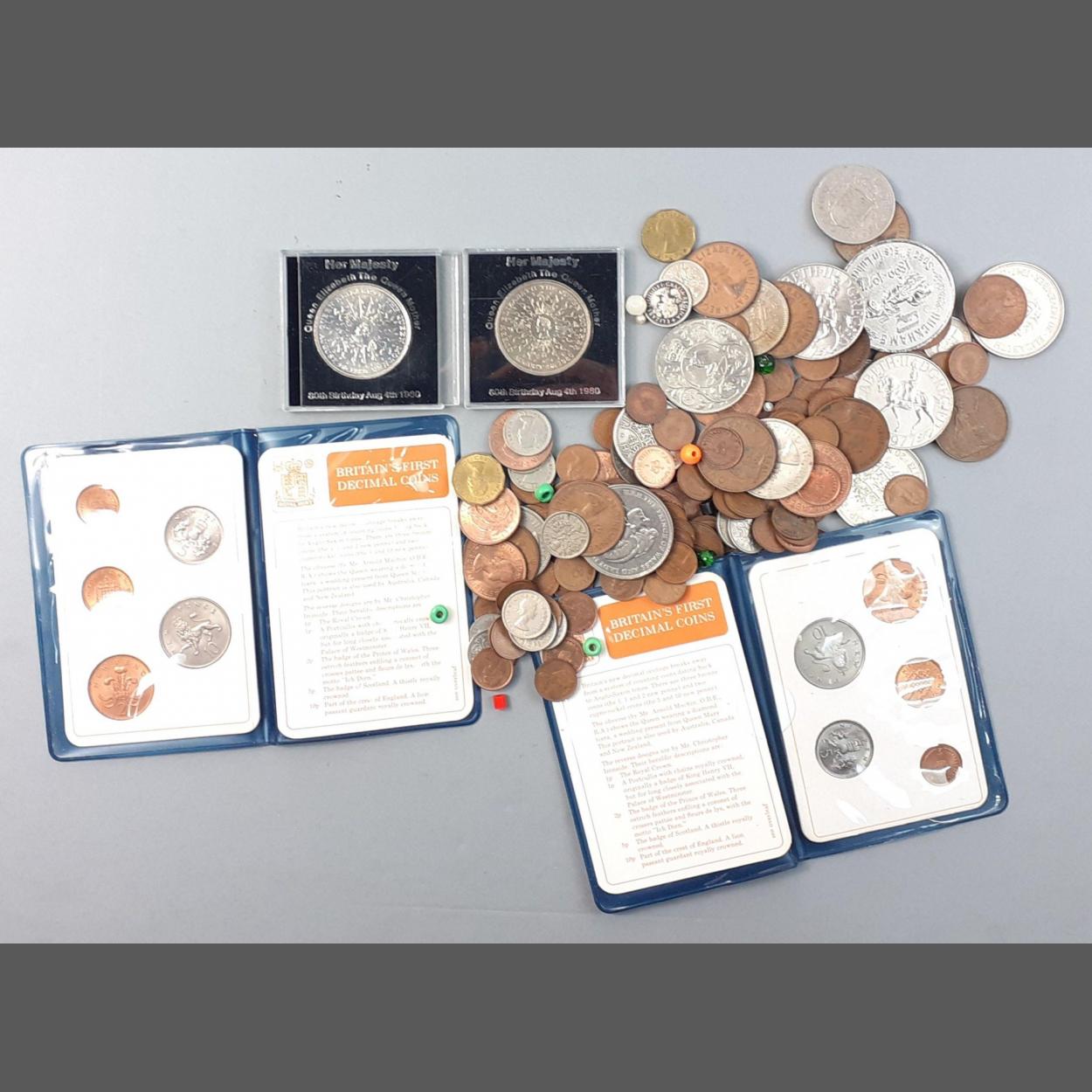 A collection of obsolete UK coinage to include crowns, etc, etc and 2 cased sets of UK decimals