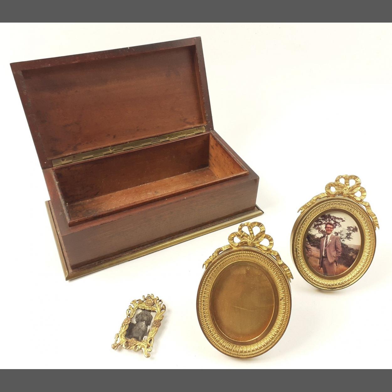 A very attractive brass banded hinged vintage cigarette box containing 3 useful photo frames, the largest approx 8cm