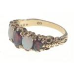 A 375 fully hallmarked opal and garnet ring, largest centre stone measures 6mm approx, size O, gross weight 3.9g approx