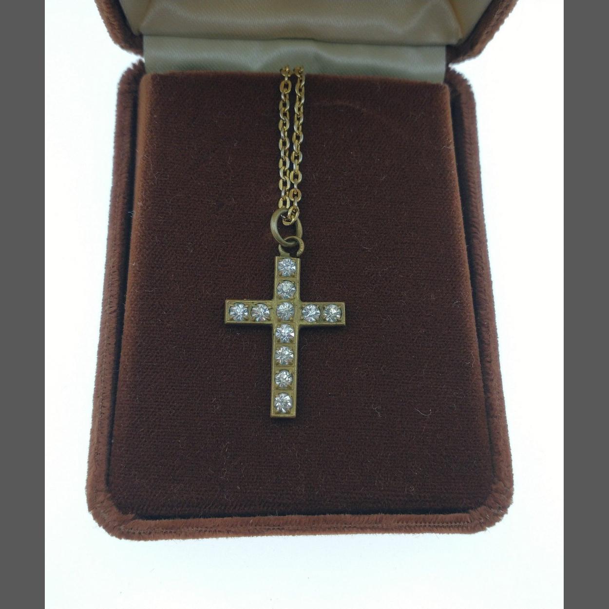 A beautiful costume jewellery crucifix on gilt chain with shiny central stones in box