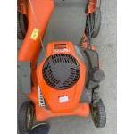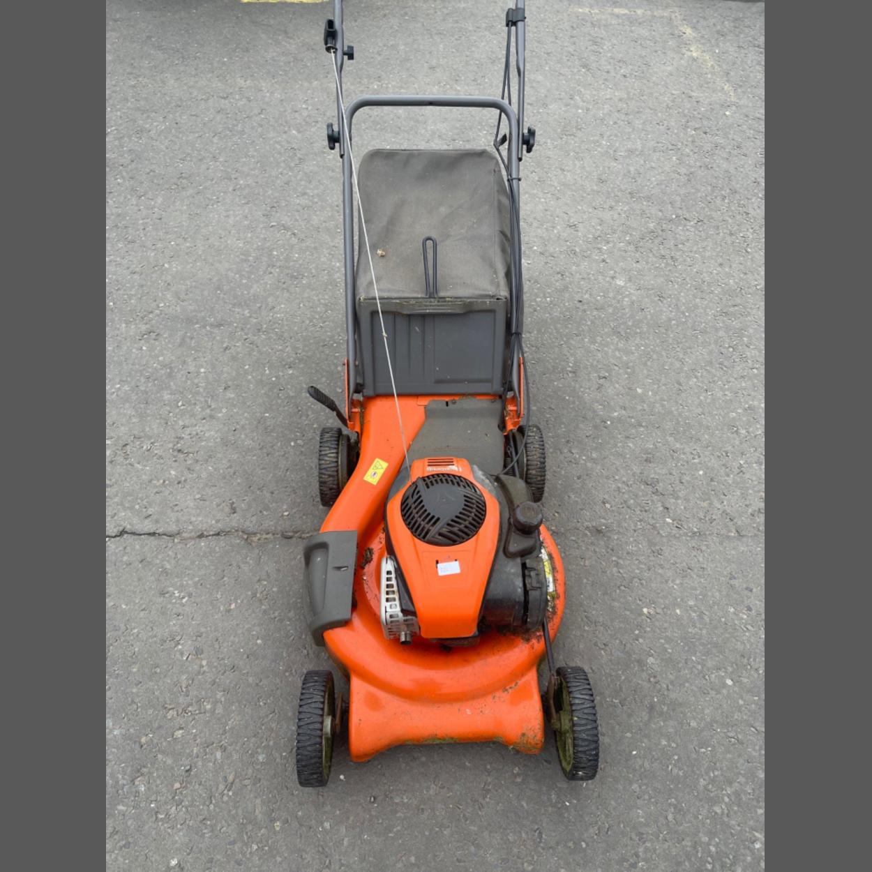 A HUSQVARNA rear gear drive petrol lawnmower with grass bucket - lawnmower sitting in a garage and will require refreshed petrol - lawnmower serviced at some point 2023