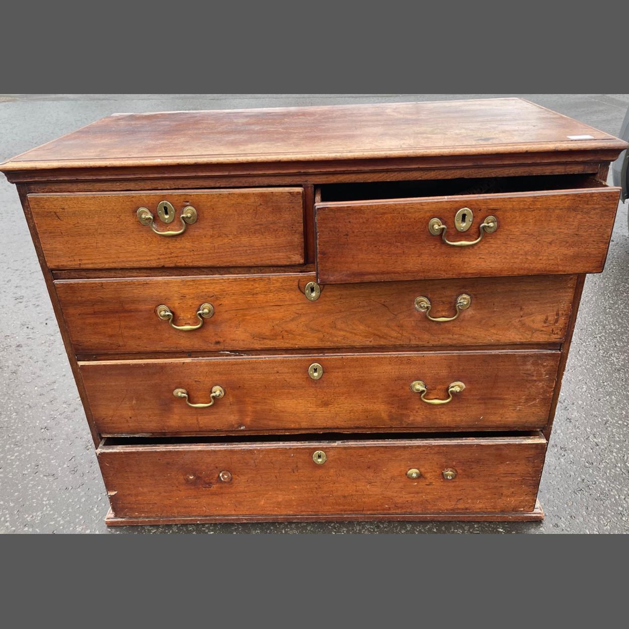 A VICTORIAN 2 over three mahogany chest of drawers - one detached handle is inside the drawer and one handle is missing and requires replacing - dimensions 4ft wide x 3.5ft height x 2ft depth approx