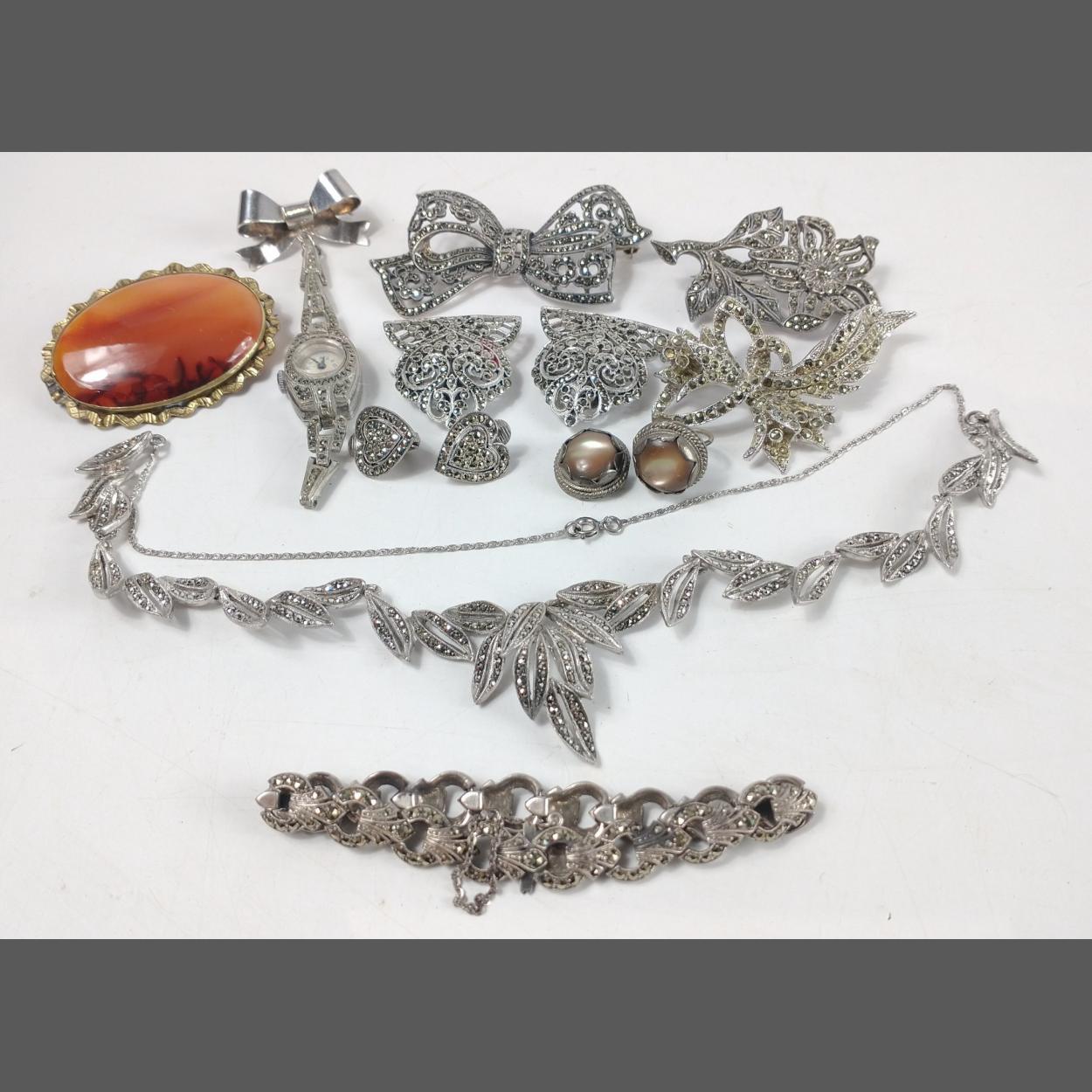 A lovely wee collection of marcasite jewellery to include 1 necklace, 1 bracelet, 3 brooches, 1 pair of heart-shaped clip-on earrings, 1 pair of dress clips, a nurse's watch and a large cameo style brooch etc