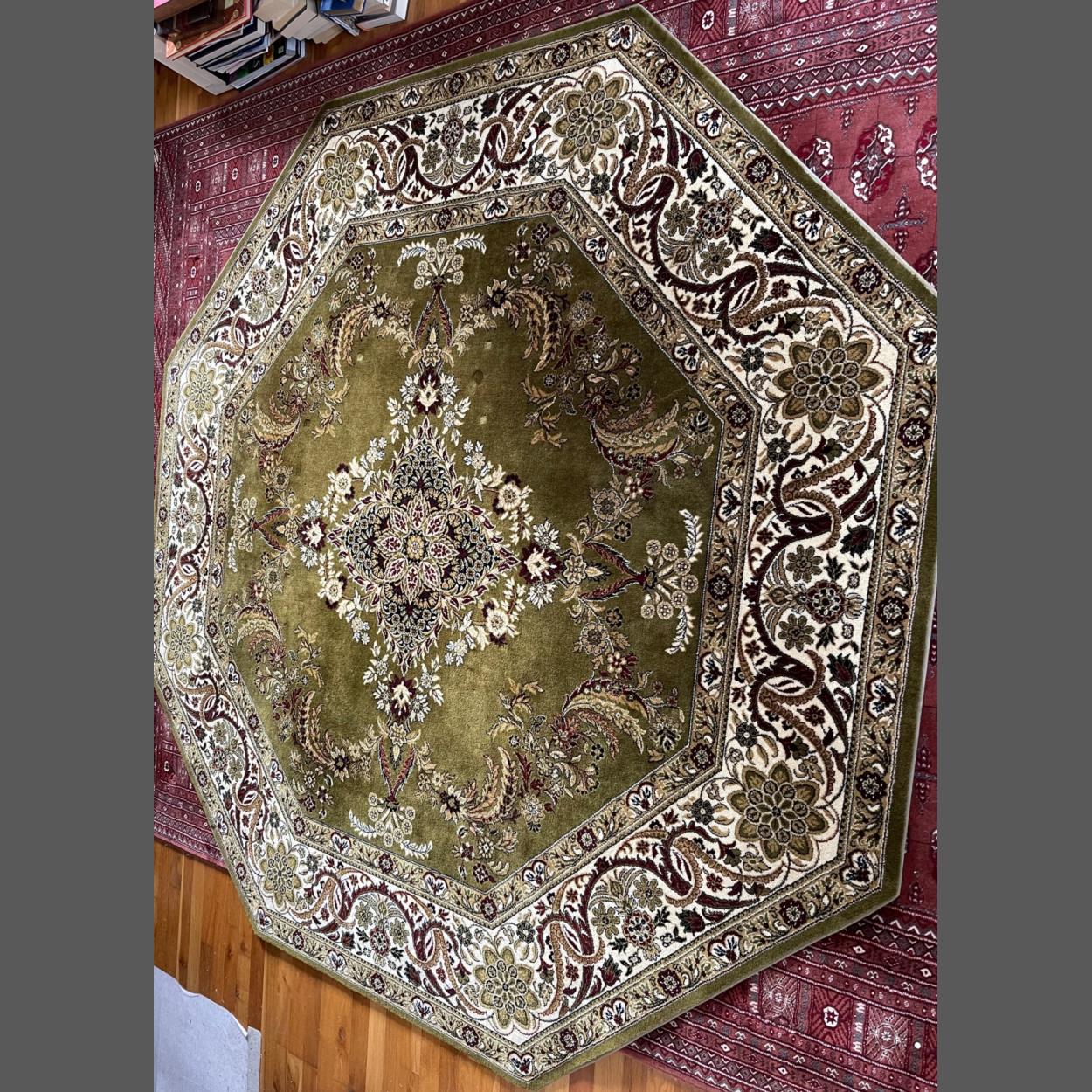 A RETRO SUPER KESHAN Hand-made Carpets Ltd octagonal green based patterned rug - dimensions 2.5m diameter approx - remarkable condition