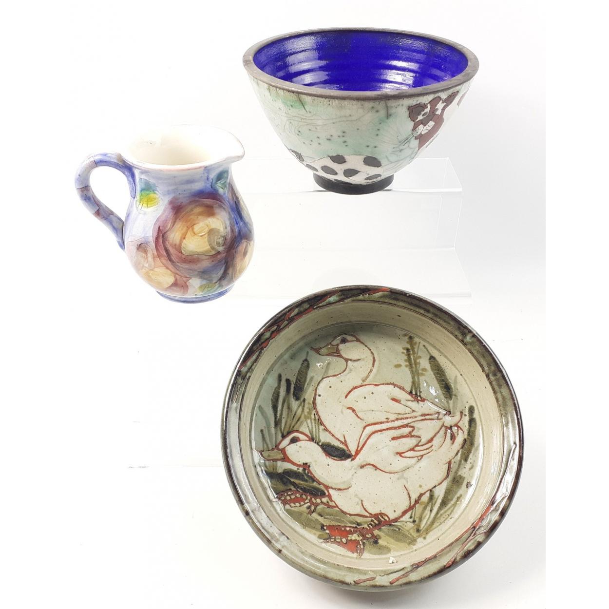 Three pieces of studio ware to include a 22cm shallow bowl with ducks, a blue bowl and a 13cm jug