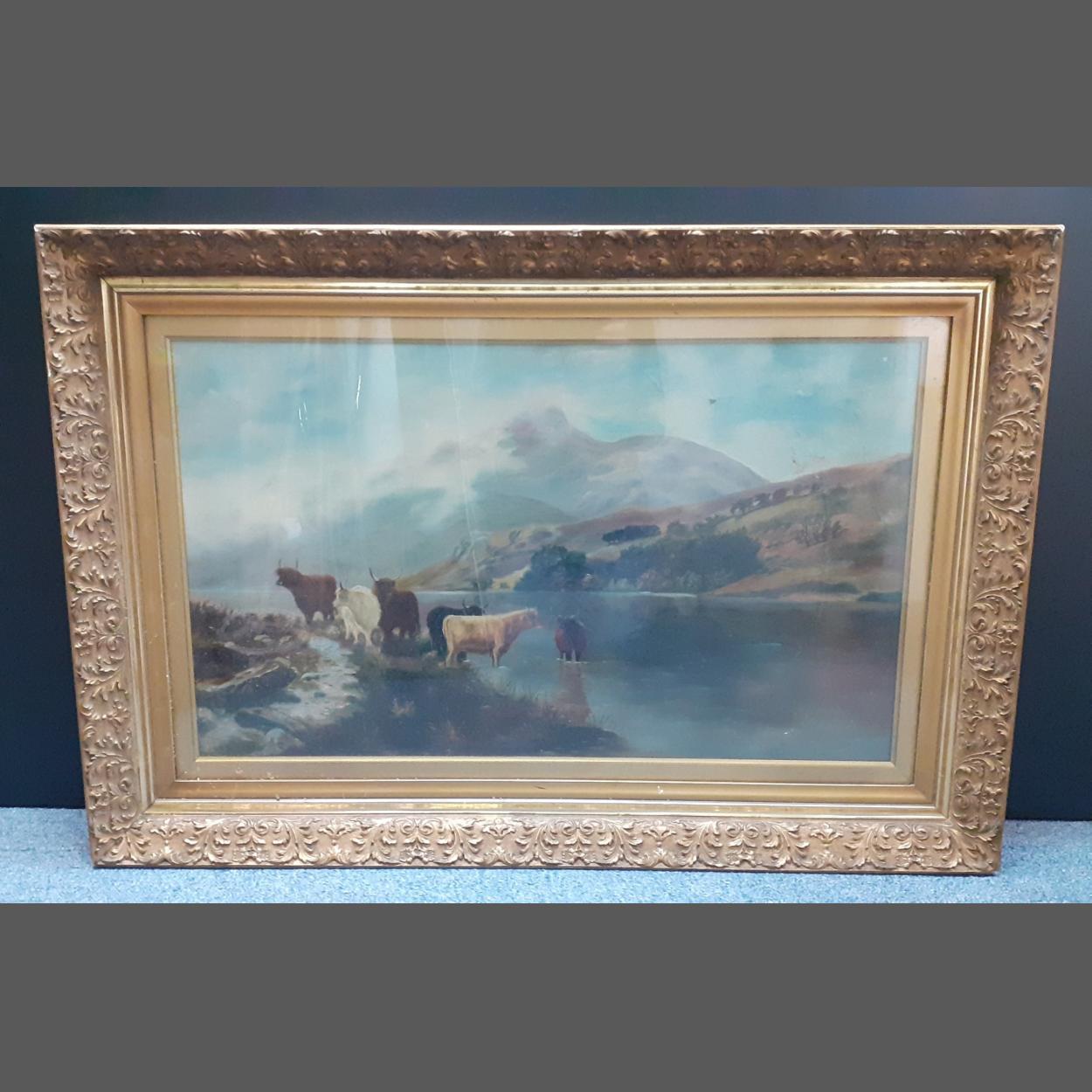 A gilt framed SCOTTISH VICTORIAN oil on canvas HIGHLAND CATTLE scene - no artist signature visible - dimensions 30" x 18" - condition there has been slight flake of oil loss top right hand corner on the clouds, with cracking on the surface surrounding this
