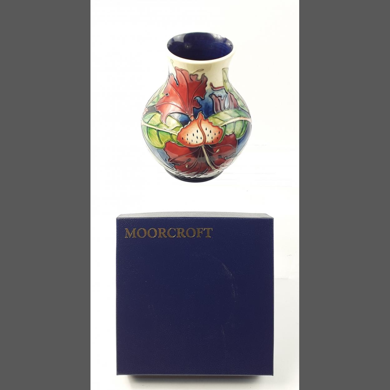 A boxed MOORCROFT hibiscus vase 15cm high. In very good condition