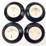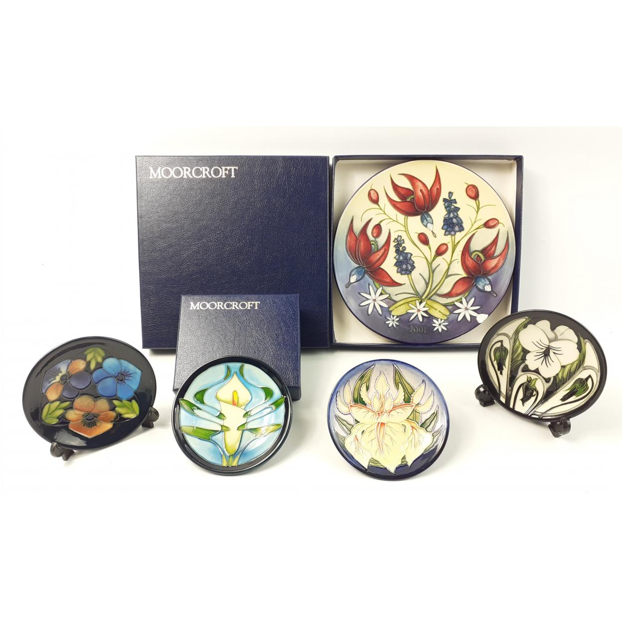 Four 12cm MOORCROFT signed and dated pin dishes, all signed and dated and also a 22cm collector's plate in box, with damage