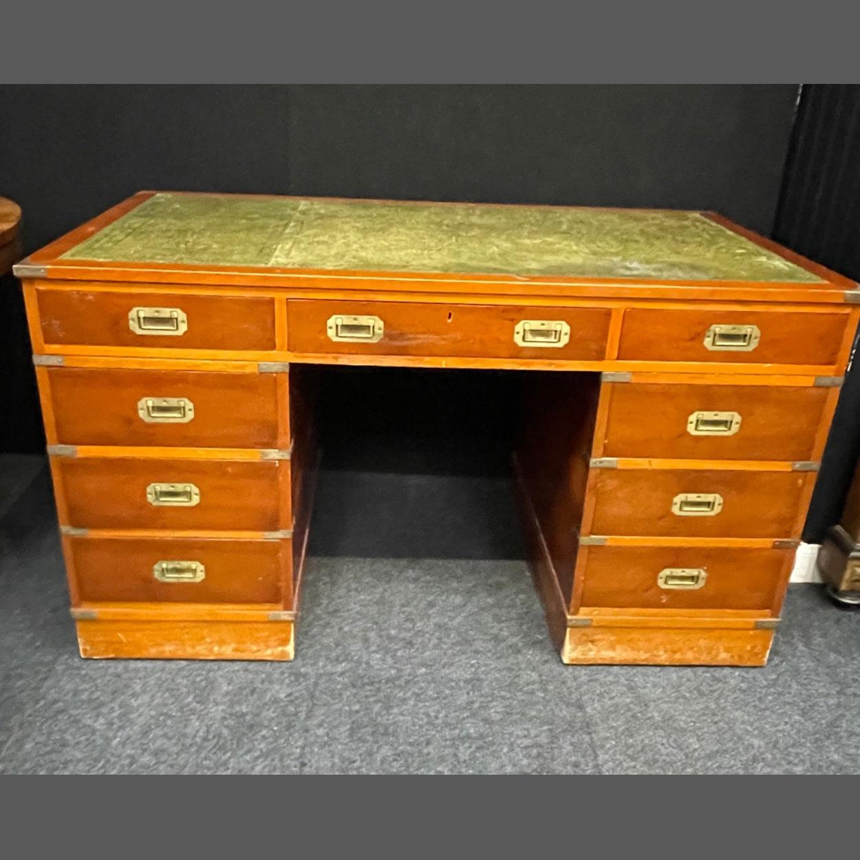 A large kneehole writing desk with 9 drawers and original brass handles, brass fittings, and a green leather writing top - comes in 3 pieces - dimensions 125cm length x 75cm depth x 77cm height approx