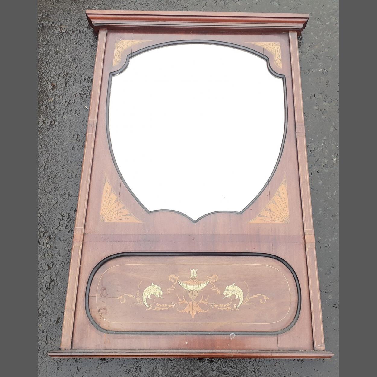 An antique bevelled shield-shaped glass wall mirror with dolphinesque motif inlay measures 106 x73cm. This item matches the bow-fronted sideboard. A beautiful piece.