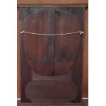 An antique bevelled shield-shaped glass wall mirror with dolphinesque motif inlay measures 106 x73cm. This item matches the bow-fronted sideboard. A beautiful piece.