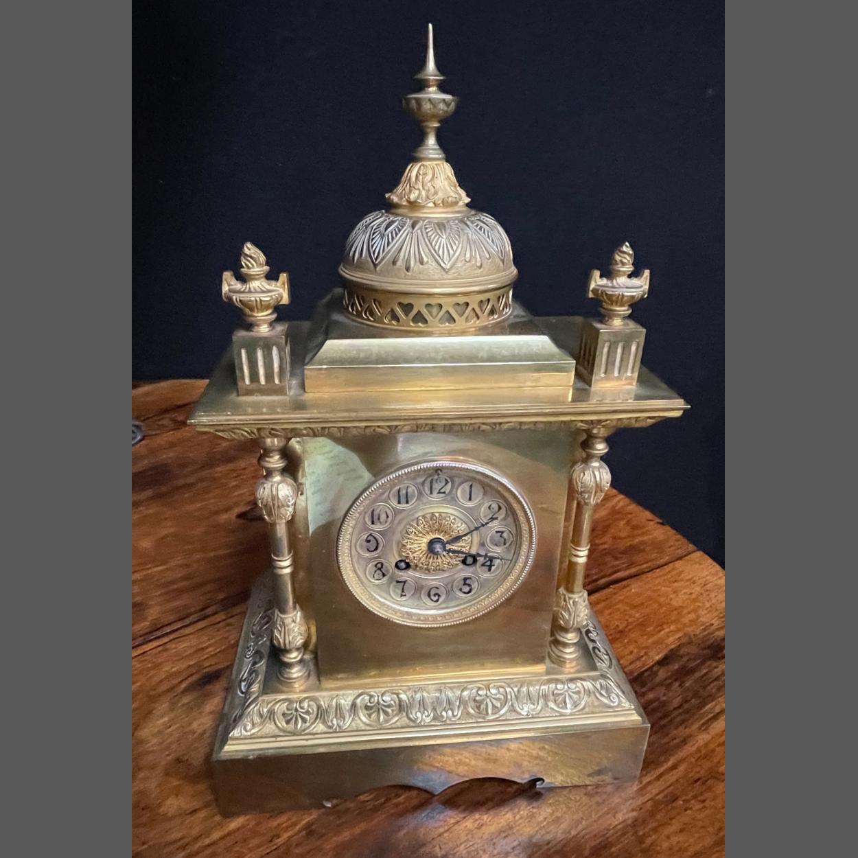 Antique 19th century French JAPY FRERES gilt brass mantle clock on a plynth - back movement cover is missing and the glass from the face is also missing - dimensions 47cm height x 28cm width x 18cm depth approx