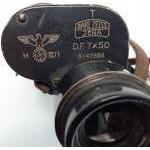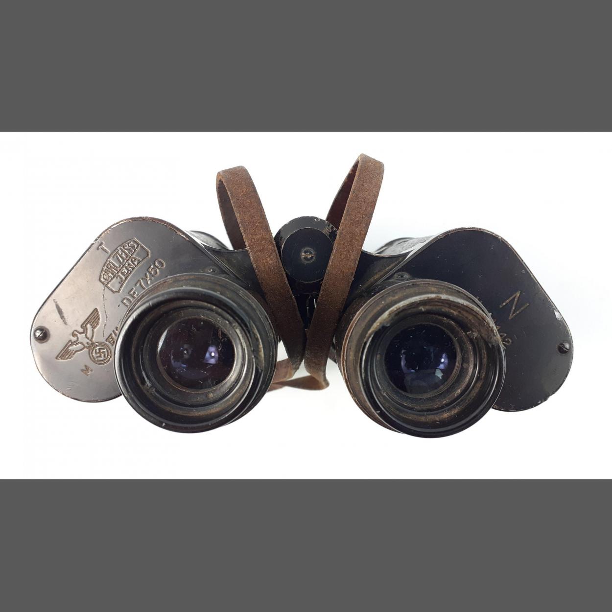 A pair of WWII Carl Zeiss Jena 7x50 Kreigsmarine M IV/I binoculars with Eagle and Swastika marks. Serial number Nr.41142. According to the vendor her father acquired these from a downed German bomber in the North Berwick area of East Lothian and were used ever since by the family for watching birds in the garden. Optically good, strap appears original. One eyepiece cracked otherwise in excellent condition.