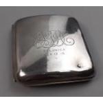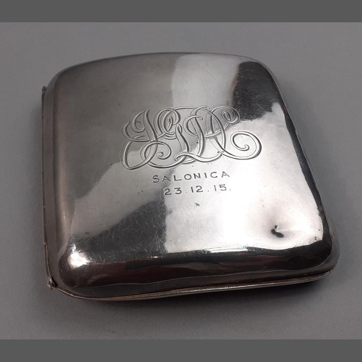 Sterling SILVER WWI interest monogrammed cigarette case inscribed SALONIKA 23.12.15 Case measures 9cm x 9cm approx and weighs 119g approx. Hallmarked Sheffield 1915 Walker & Hall.