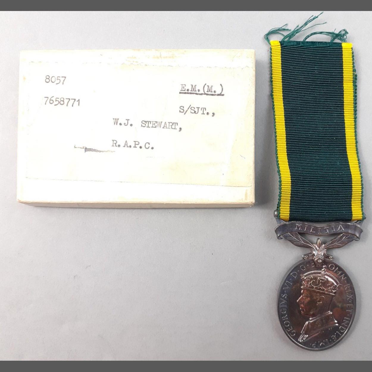 A George VI Military Territorial Efficiency Service Medal with MILITIA bar. Rim inscribed to 7658771 S. Sjt. W.J. Stewart R.A.P.C. with box of issue and original ribbon.