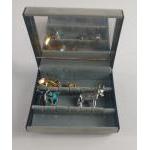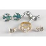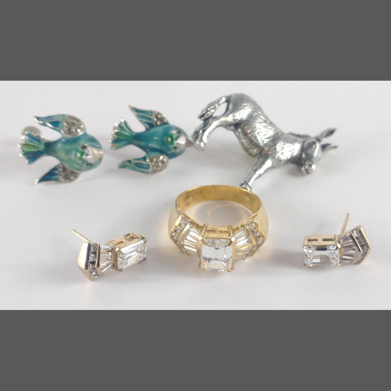A small DONKEY pin brooch 3cm width, also a 925 gilded ring and matching earrings and lastly a nice pair of clip-on enamelled singing birds
