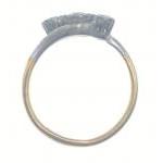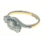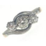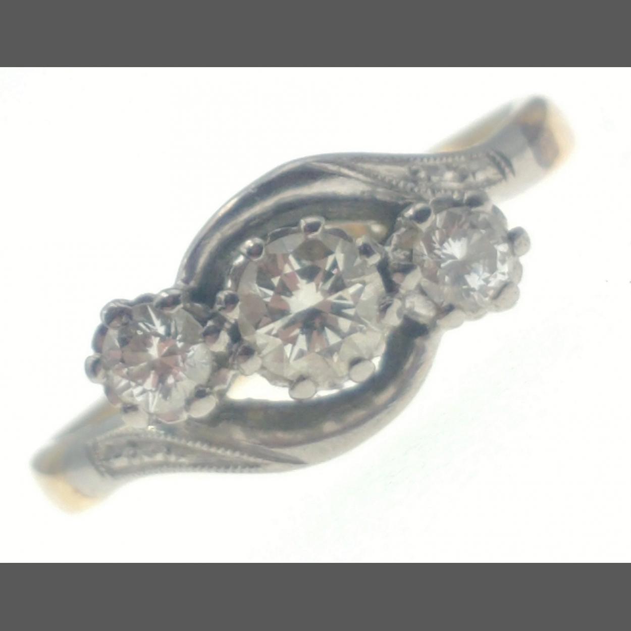An 18ct stamped gold / platinum ring with three lovely diamonds on twist shank. Centre diamond 4mm approx. Size L, gross weight 3.6g approx