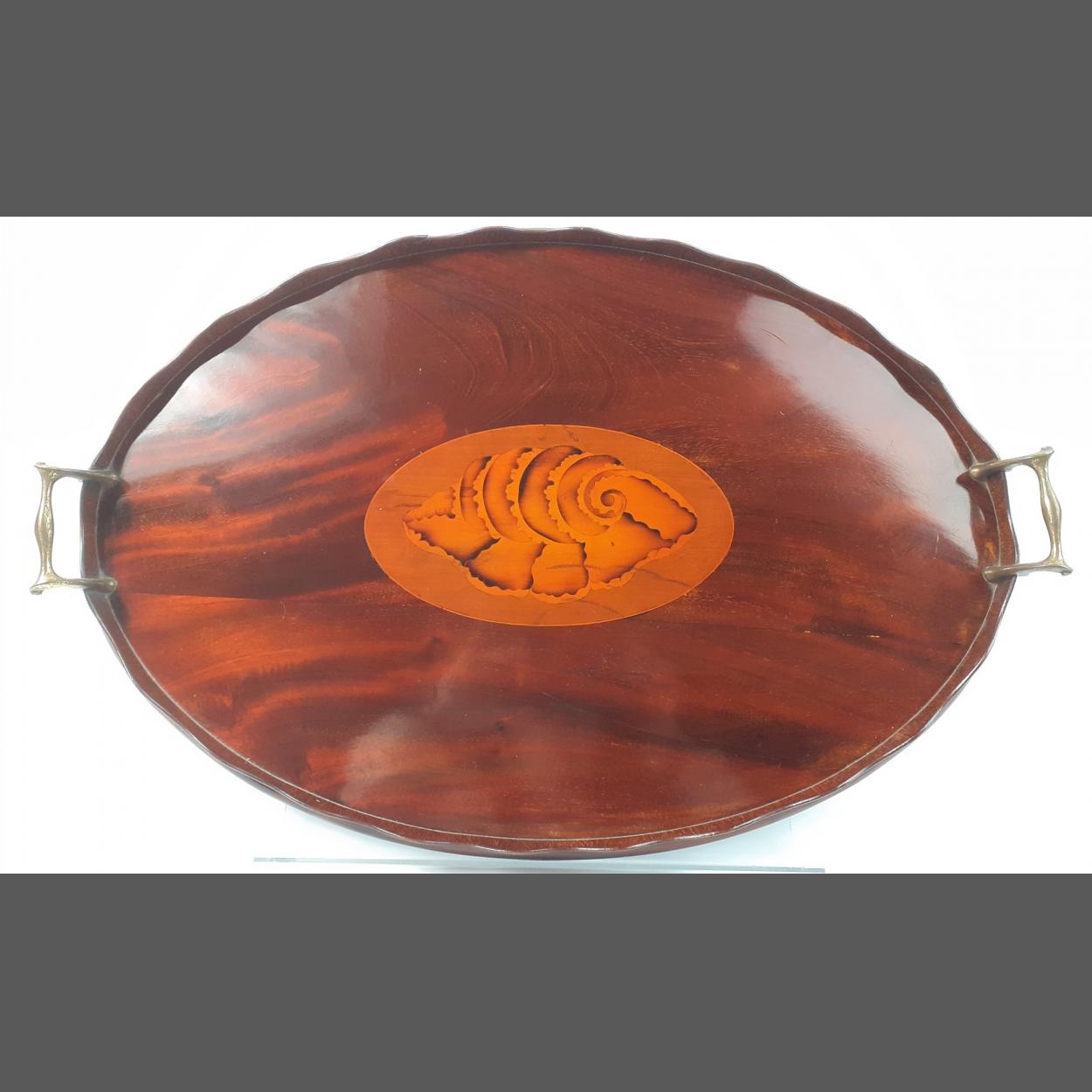 A beautiful late Victorian/Edwardian oval galleried rosewood serving tray with brass handles and a stunning conch centrepiece. The tray measures 57cm across and is in very good condition with one light chip to the rim.