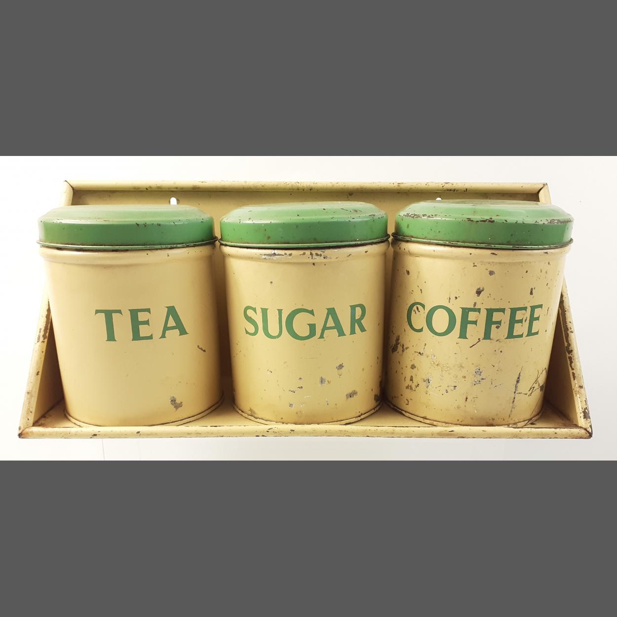 A wonderful c1960s Tala tin wall shelf with three beige caddy cannisters with green tops. Each caddy tin 14cm high. Well used but still in good condition.
