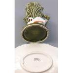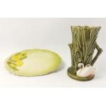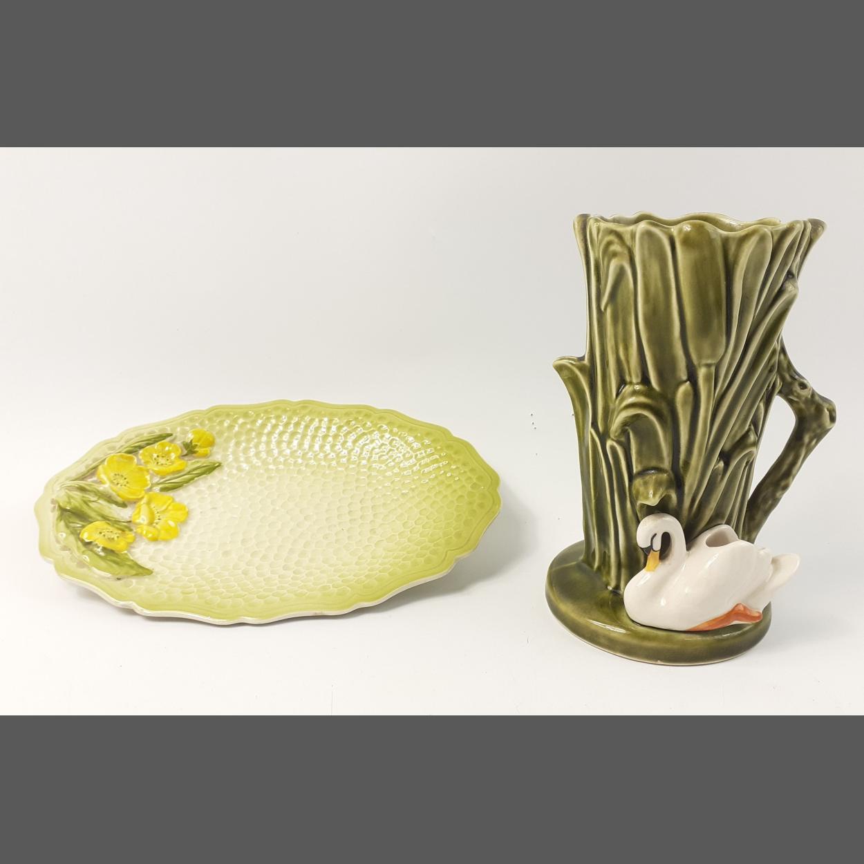 A very wonderful swan motif Sylvac spill vase- in very good condition with no damage - pattern number 4377. Standing 15 cm. Also a green dish with pretty yellow flowers.