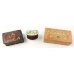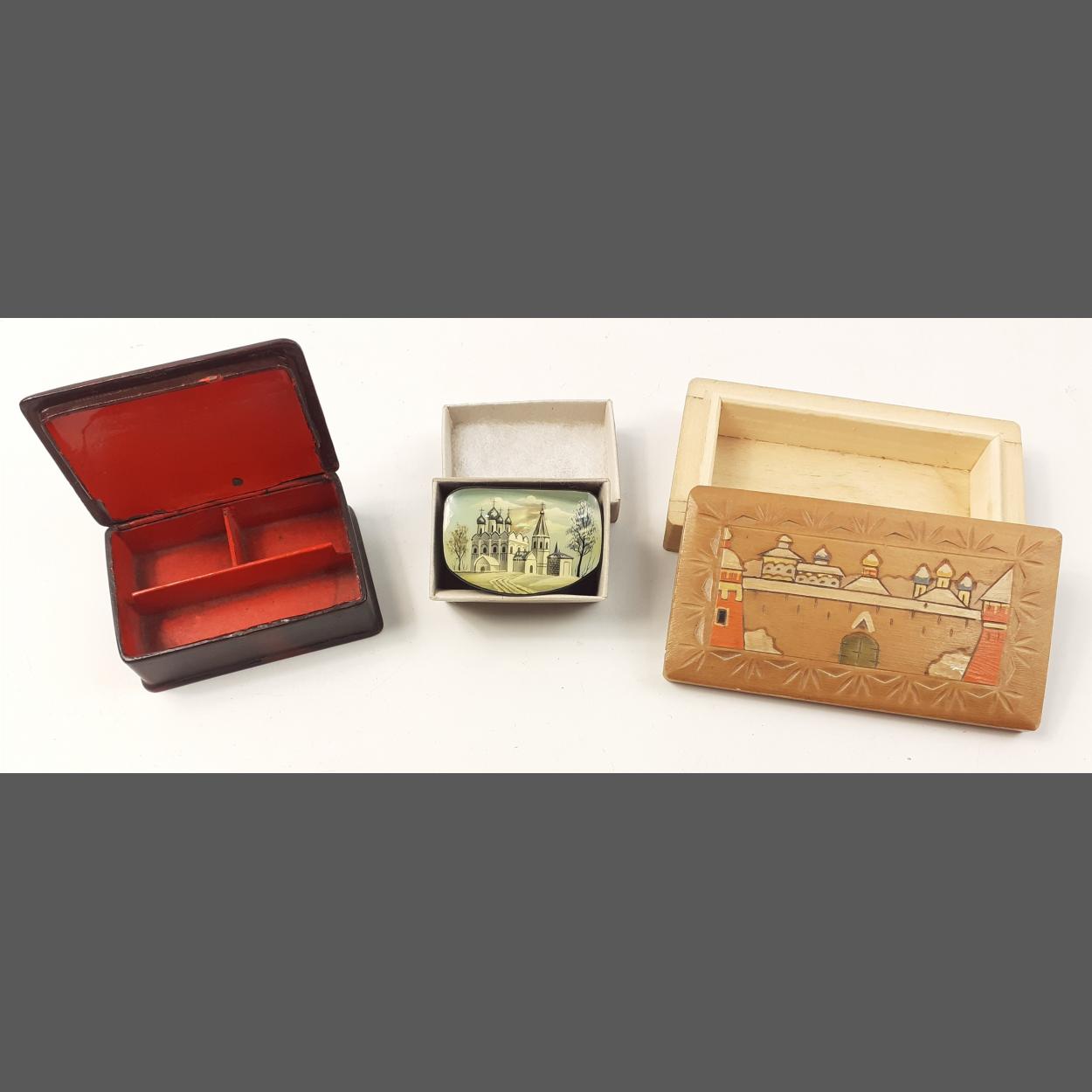 Nice selection of three small boxes - one a papier-mâché style antique box with painted motif - 9cm across. A small modern Russian scene box, and a wooden box with Russian fortress scene.