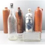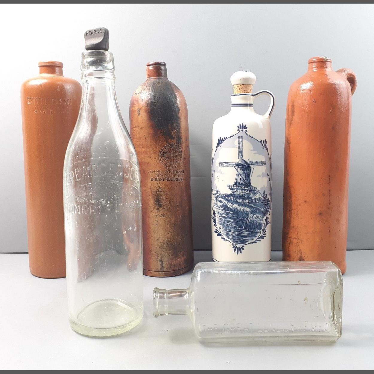 A wonderful collection of 4 stoneware wine bottles to include a Georgkreuzberg Rheinpreussen - very old stoneware bottle, 1 x Lucas bol of Amsterdam, 1 Bols newer flagon and one other. Lot also includes a Pearce of Innerleithen juice bottle and a cough bowl.
