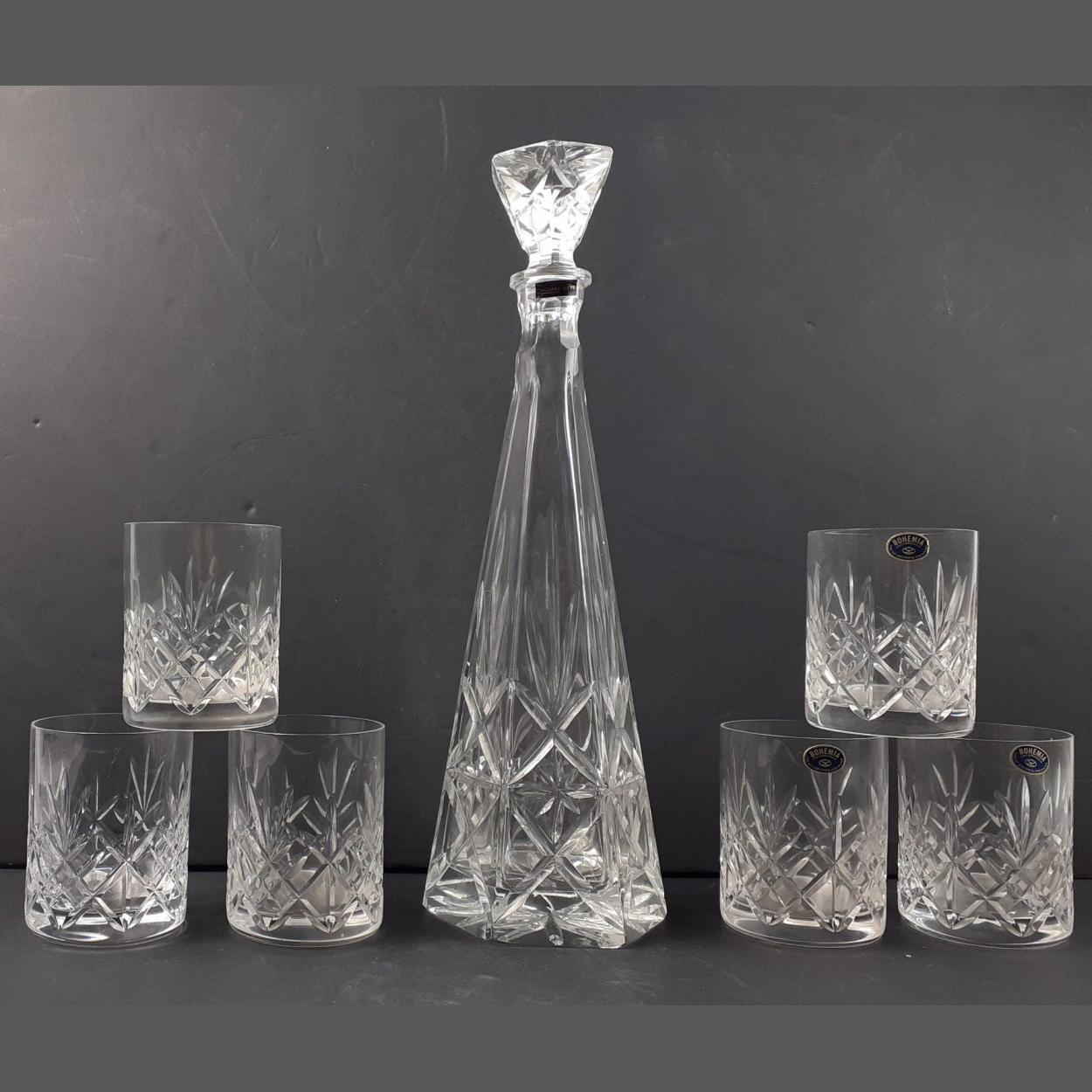 A THOMAS WEBB tall neck crystal cut-glass decanter (dimensions 15" tall approx) complete with heavy glass stopper and also six whisky tumblers