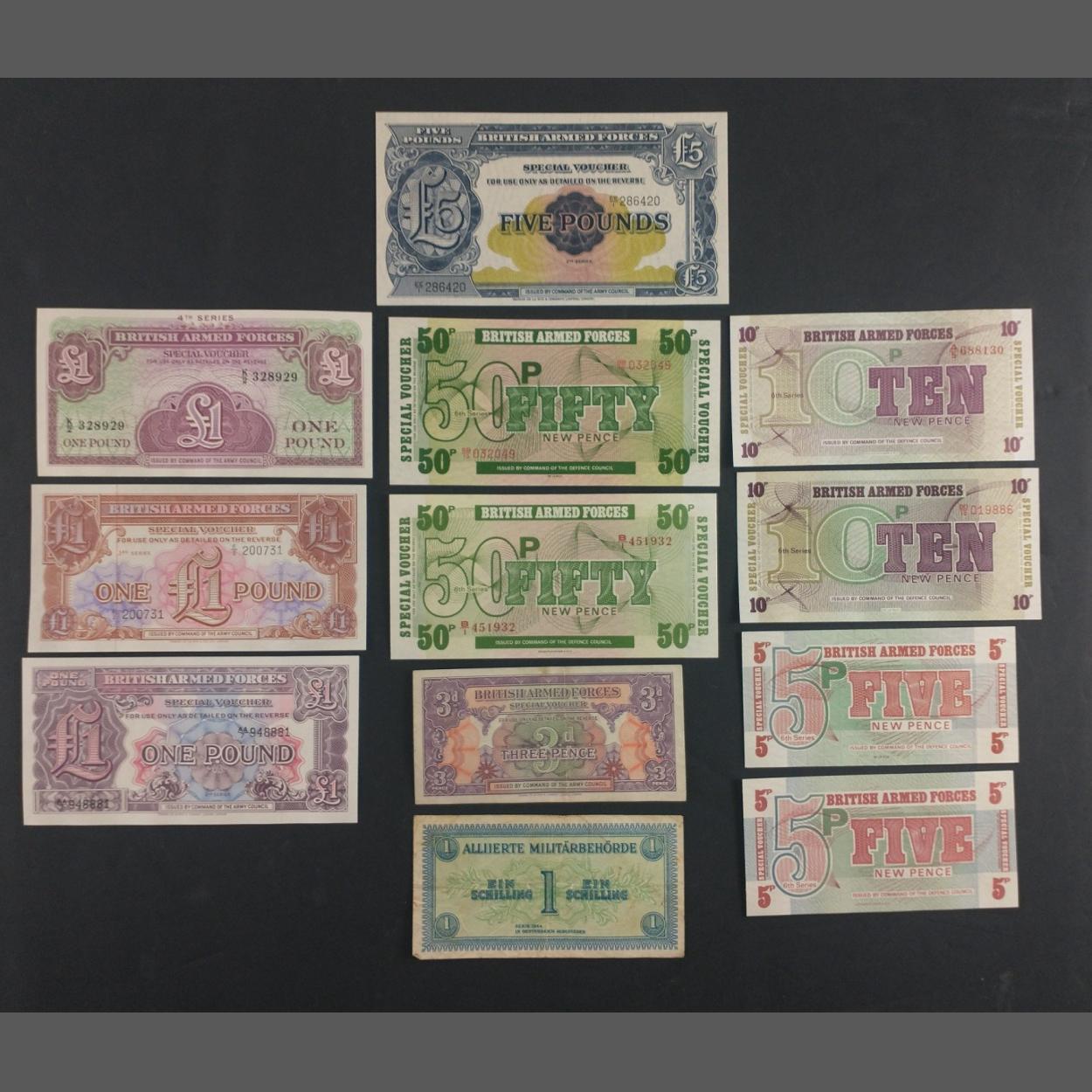 Three Banknote album pages containing eleven BRITISH ARMED FORCES banknotes in good collectible condition. Lot also includes an ALLIERTE MILTARBEHORDE Ein Schilling from 1944. Interesting lot.