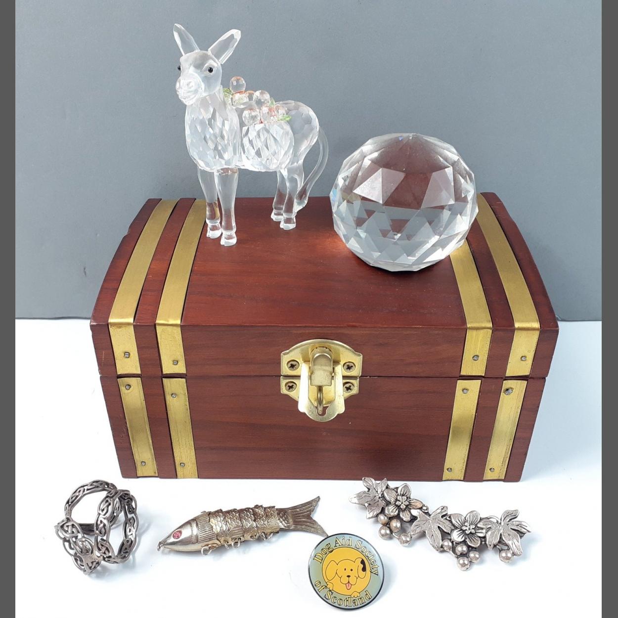 A small lidded wooden trinket box 6" x 4" x 3" height with contents to include a table crystal paperweight 2" height, a SWAROVSKI crystal style donkey ornament 3" height approx - also some costume white metal pieces to include an articulated fish etc