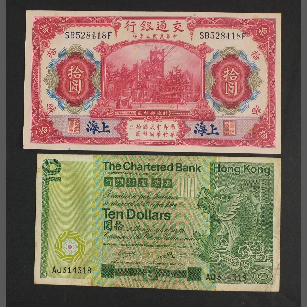 Probably the most vibrant note in today’s auction. A 1914 10 Yuan Shanghai Bank of Communications overprint. In good collectable grade. Comes with a Hong Kong 10 Dollars.
