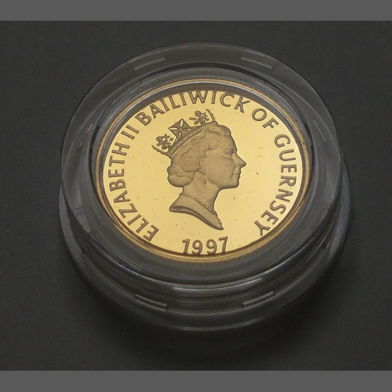 A stunning 1997 Guernsey GOLD PROOF £25 coin with Royal Mint Certificate. Beautifully presented in a case. Coin is encapsulated 22m across - just under 8g approx of 22ct gold