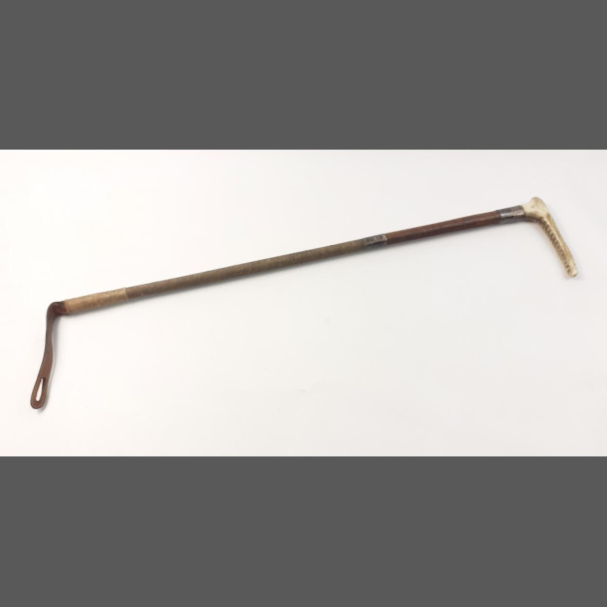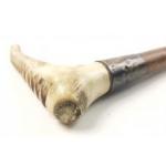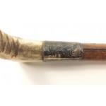 A silver collared, horn handled riding crop with an 1889 inscription, measures 70cm, excluding the leather tip