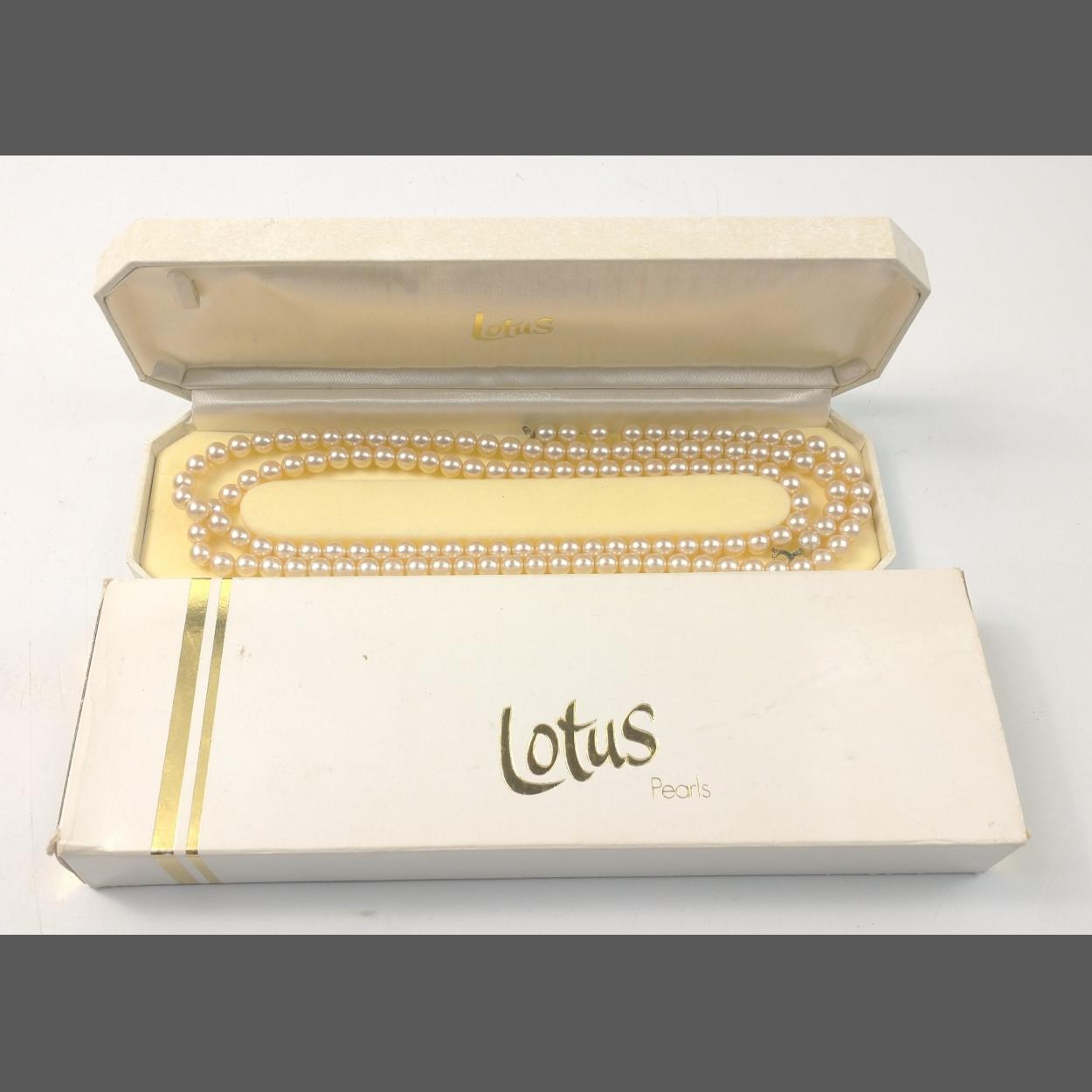 A boxed and cased set of well presented simulated LORUS pearls. 110cm long single strand with worn clasp.