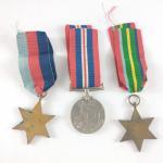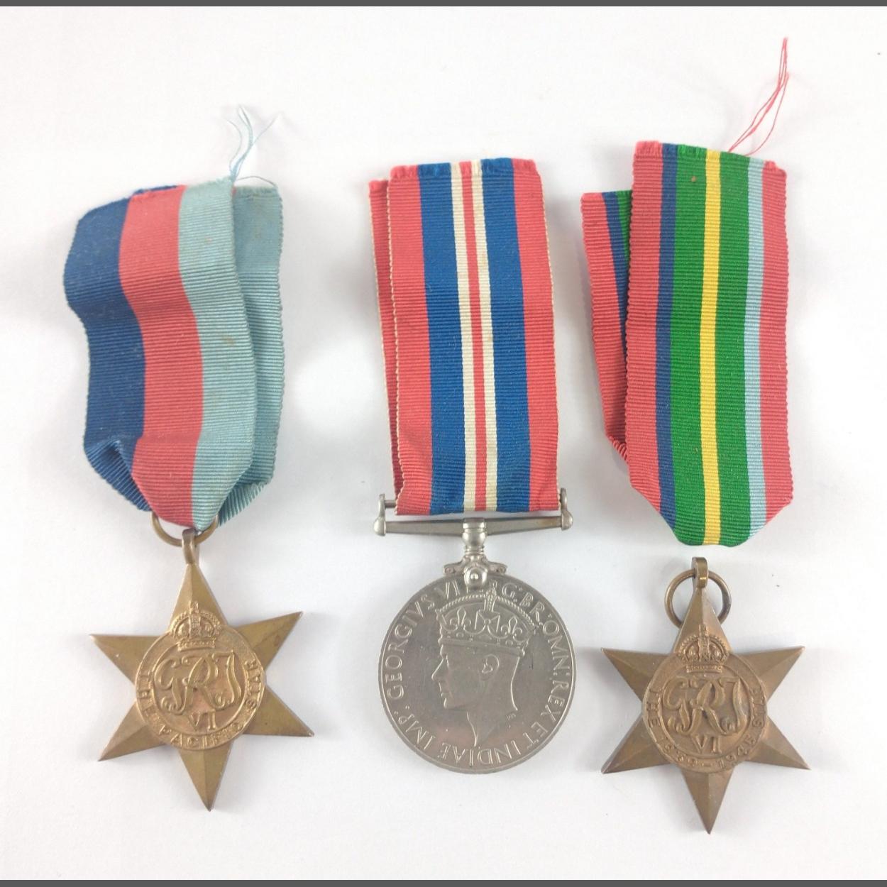 Three WWII British War Medals to include 39-45 Star, Pacific Star, War Service Medal. Lot includes a Burma star ribbon only