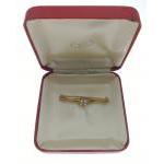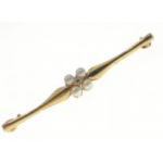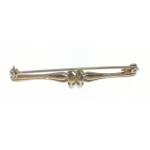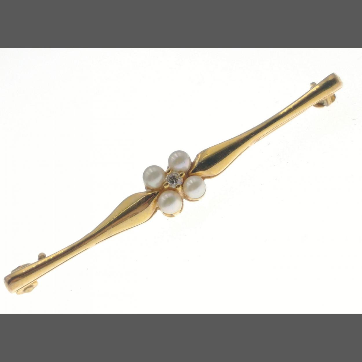 A pretty fully hallmarked 375 GOLD bar brooch with four seed pearls surrounding a centre diamond (tested). Gross weight 3.15g approx. Measures 5cm approx. A lovely piece in very good order with working clasp.
