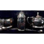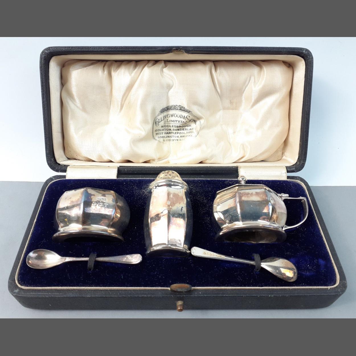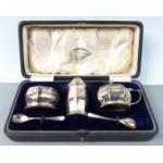 A COLLINGWOOD Jeweller's cased box containing a lovely sterling silver condiment set. Birmingham hallmarks slight variance in dates c1923. One missing blue liner. Total weight excl. liner 77g approx.
