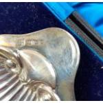 A cased sterling silver clamshell butter dish with butter knife. Hallmarked Sheffield 1924. Weight 46.45g approx