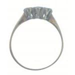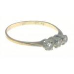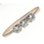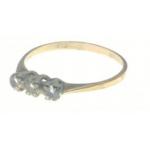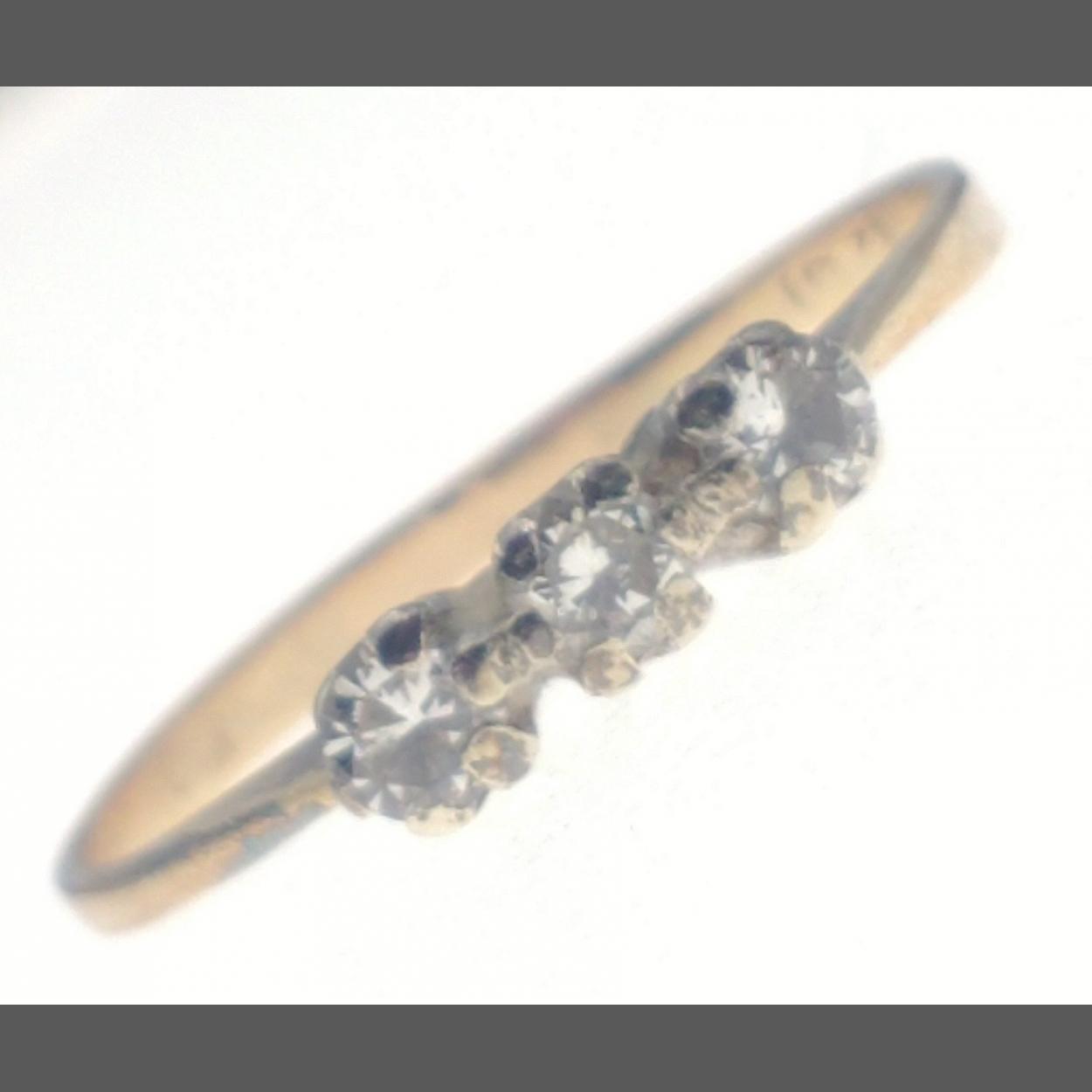 A yellow metal ring with indistinct markings, set with three diamonds (tested), stones each approx 3mm x 3mm, size P, gross weight 1.25g approx